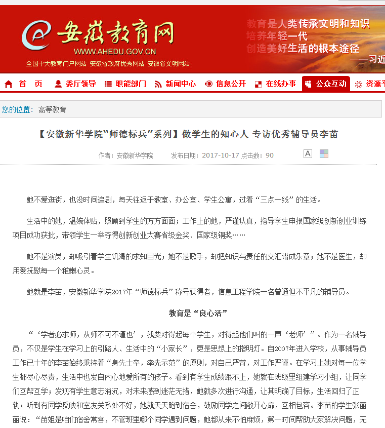 安徽教育网:【WilliamHill官方网站“师德标兵”系列】做学生的知心人 专访优秀辅导员李苗
