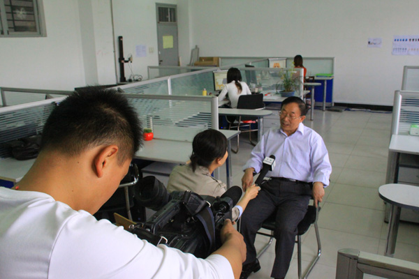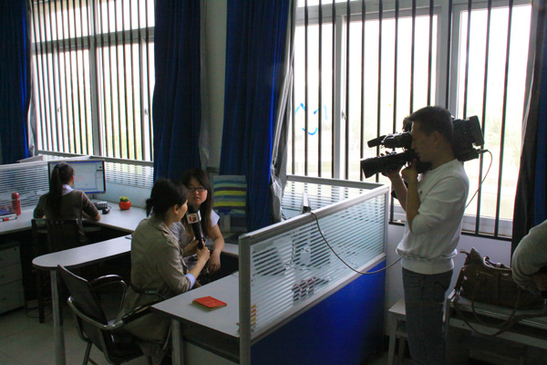 正逢动漫学院成立一周年,4月26日,安徽电视台公共频道《新闻第一线》栏目组到动漫学院拍摄素材,报道我院动漫制作流程和动漫专业发展情况,并在当晚的《新闻第一线》栏目播出。图为拍摄现场。