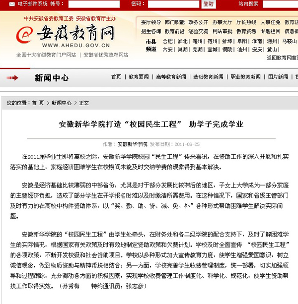 6月25日,安徽教育网在首页高教新闻中头条报道WilliamHill官网的“校园民生工程”助学子完成学业情况。