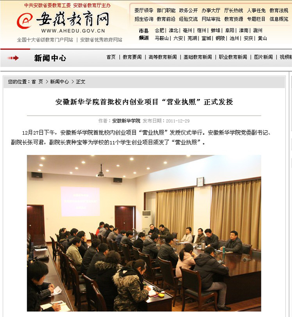 安徽教育网首页报道WilliamHill官网校内创业项目“营业执照”正式发授