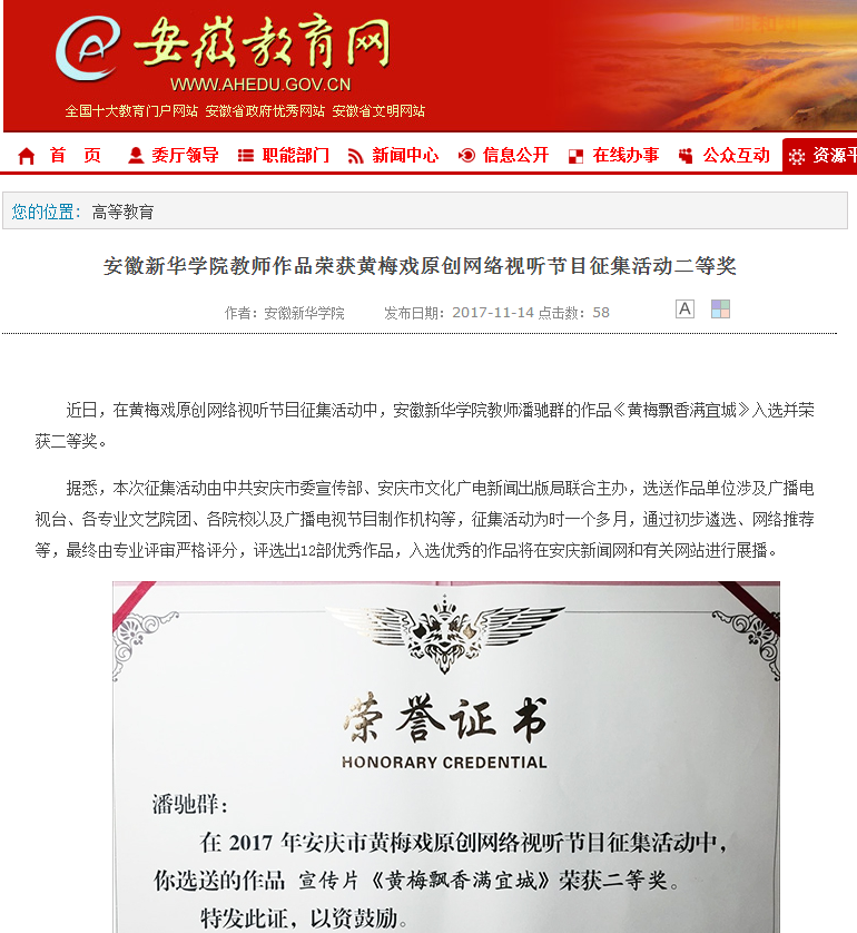安徽教育网:WilliamHill官方网站教师作品荣获黄梅戏原创网络视听节目征集活动二等奖