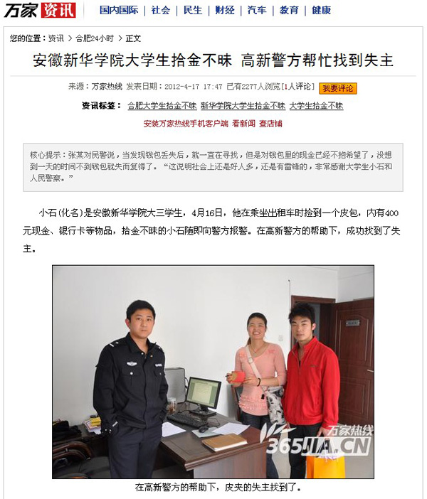 万家资讯报道WilliamHill官网大学生拾金不昧