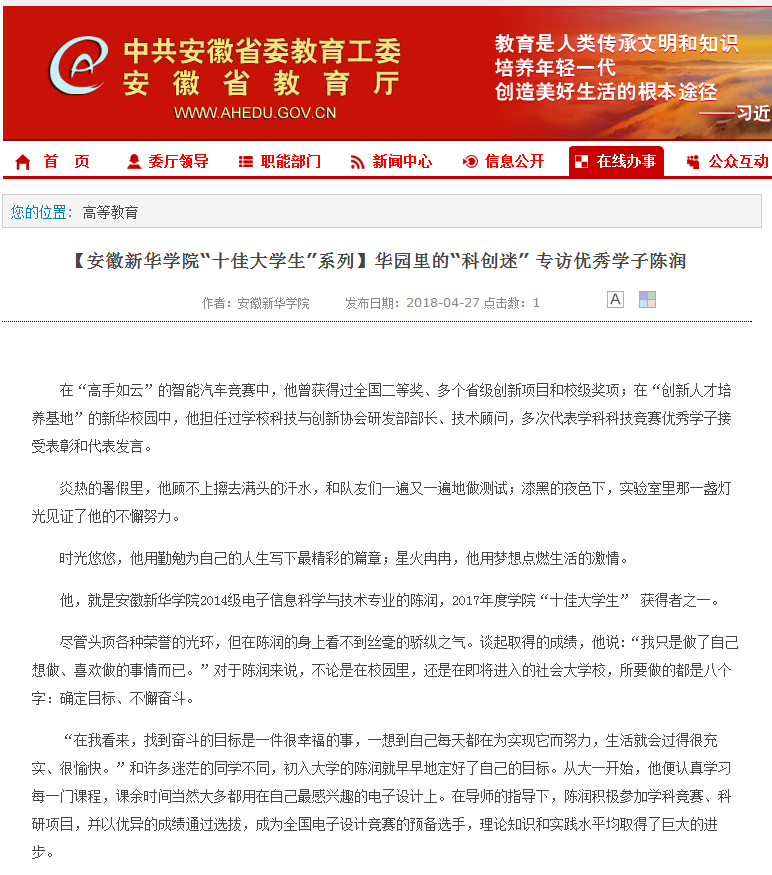 安徽教育网:【WilliamHill官方网站“十佳大学生”系列】华园里的“科创迷” 专访优秀学子陈润